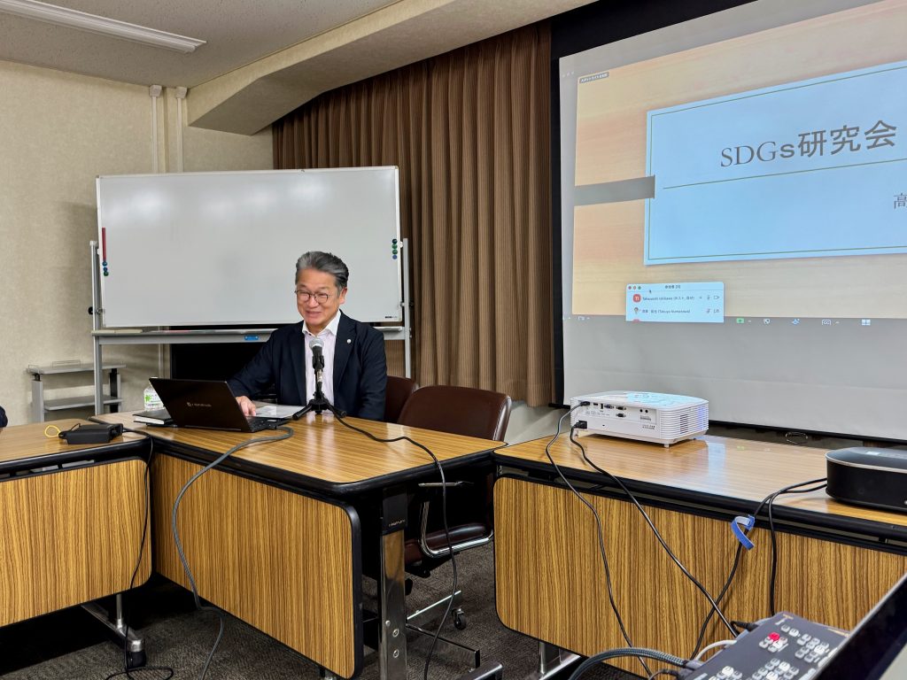 本日は、各研究会からの発表ということで「SDGs研究会」からの発表がありました。座長の高塚伸志さんから、今年の活動報告がありました。3回のゲスト講師による講演内容を紹介し、振り返ってくれました。
