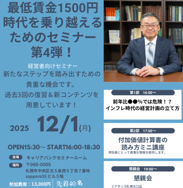 過去3回、同タイトルのセミナーを開催し好評だったことから、新しい内容を盛り込み「最低賃金1,500円時代を乗り越えるためのセミナー」の第4弾が開催されます。主な対象は企業経営者層。内容は、第1部は「インフレ時代の経営計画の立て方」。第2部は「付加価値計算書の読み方」。その後、懇親会も予定しています。